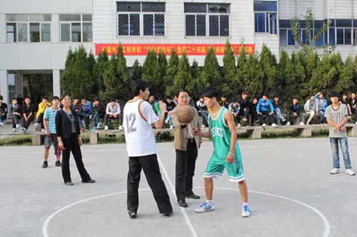 2011年10月19日下午4点30分,安徽电气工程学校篮球场内激战正酣,我校一年一度的“新地驾校杯”暨第二十四届“尊师爱生杯”篮球赛正式拉开帷幕。副校长王成武为首场比赛开球,并观看了比赛。